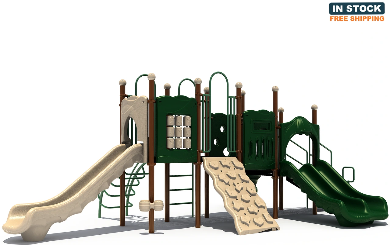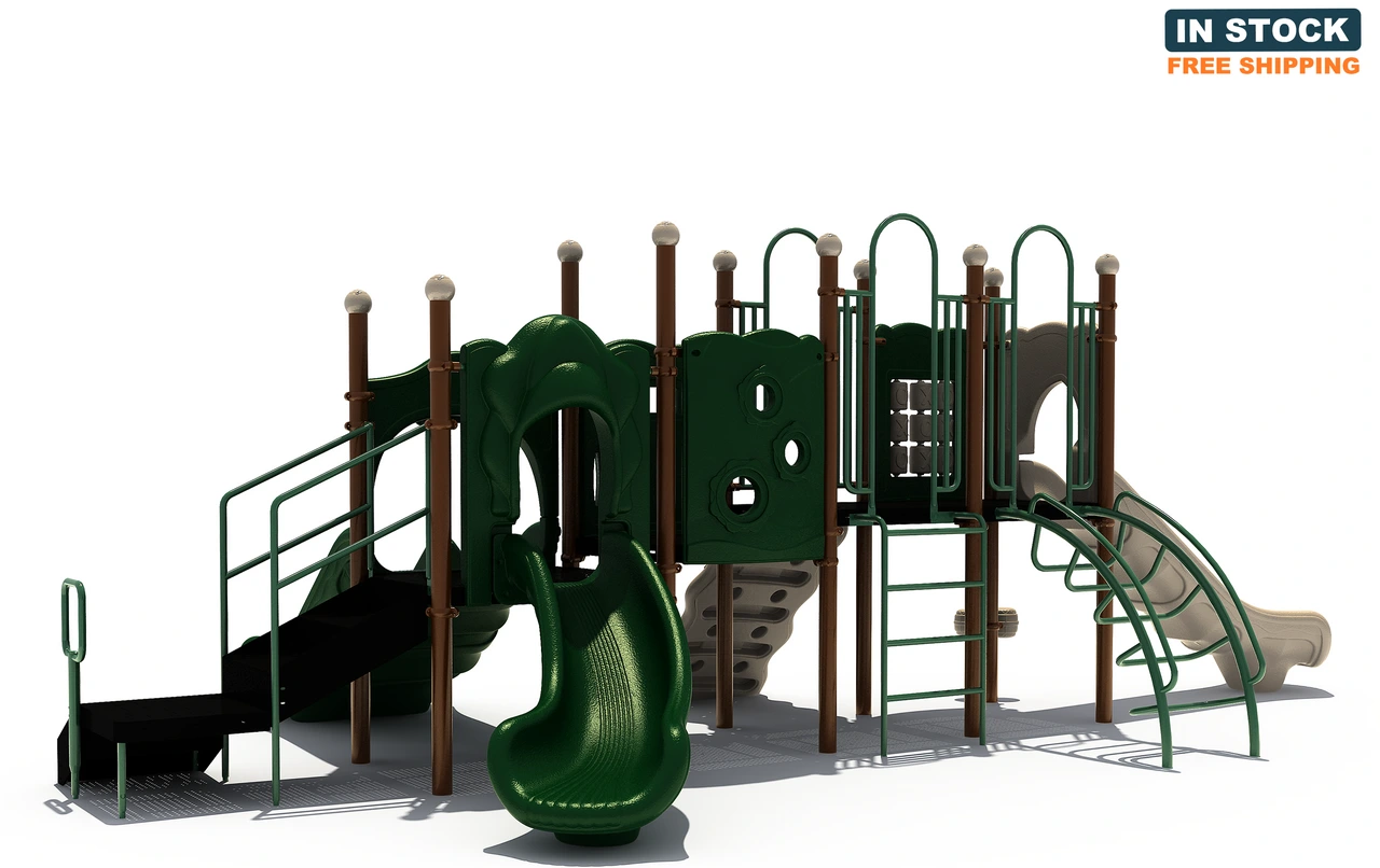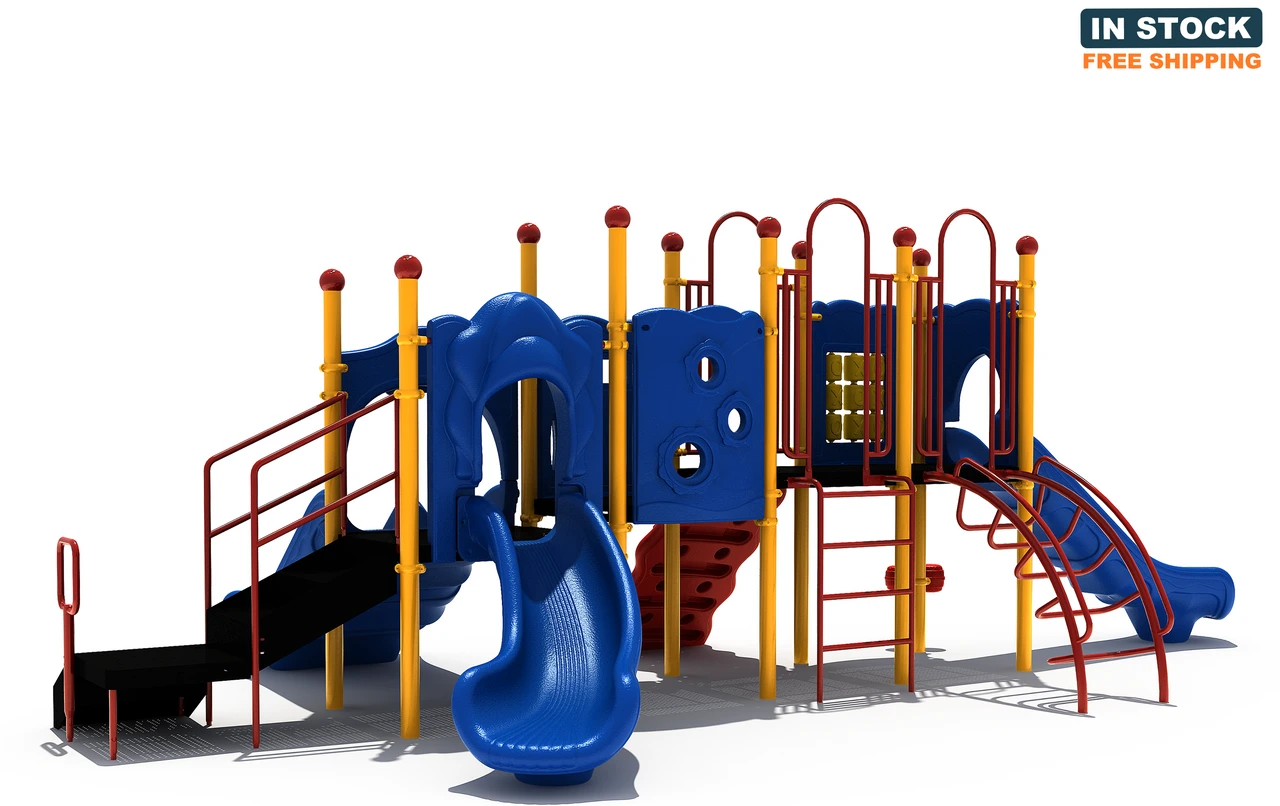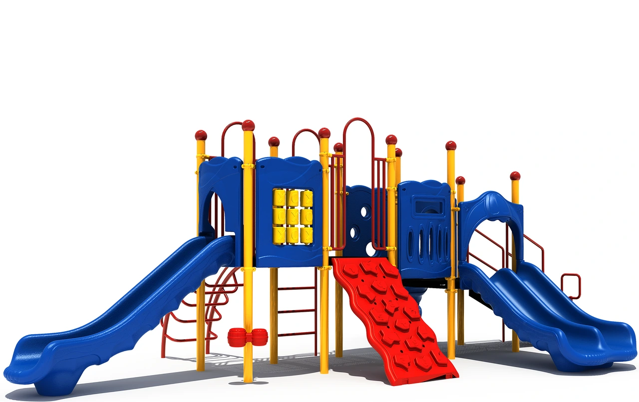 Our Chimp Champ playground is a great mid-size commercial play structure that will bring lots of excitement and fun to any school, church, or neighborhood park. It features a Double Slide, a Right Turn Slide, and a Straight Slide for maximum fun. In addition, there is an Inverted Arch Climber, Vertical Challenge Ladder, Figure Climber, and an ADA Transfer Station that kids will love. They will also love the Tic-Tac-Toe Panel and Bongo for stimulating and interactive play with others.